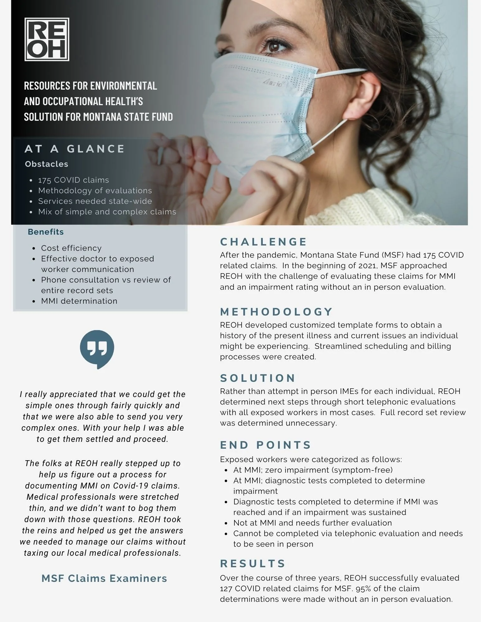Ask REOH about return to work, causation, appropriateness of treatment, impairment ratings, independent medical evaluations, pre-existing conditions, peer review, legal support, record reviews, and quick file reviews.